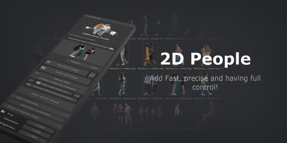 2D People is a Blender add-on that allows you to add 2d people to your projects from your 2D library's fast, precise and with full control of it, from a UI Panel. By using this addon you can greatly streamline your post-production workflow, as it eliminates the need to manually import one by one then adjust the placement, scaling, lighting, angle for the camera, etc.